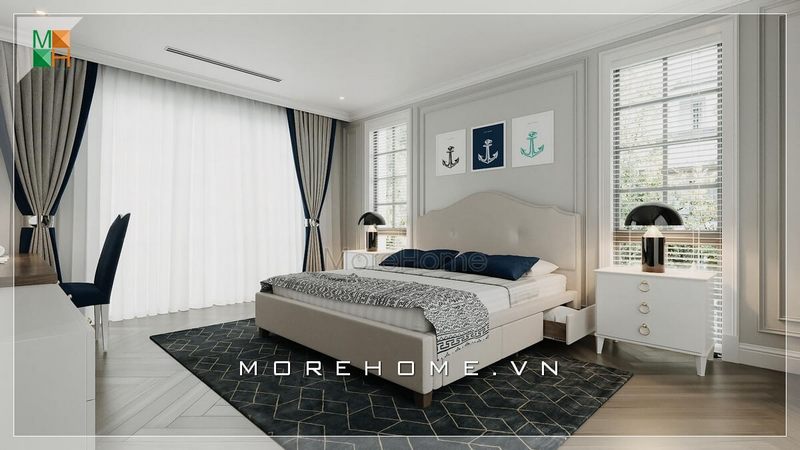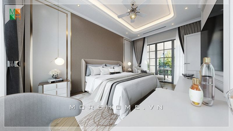 Thiết kế phòng ngủ chung cư mang phòng cách tân cổ điển, màu sắc hài hòa giữa trắng và xám khiến căn phòng trở nên sang trọng và tôn vẻ sang trọng hơn.