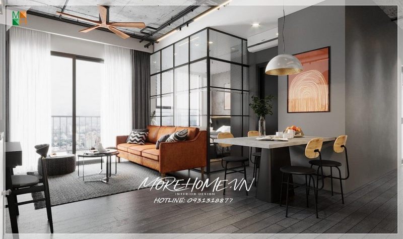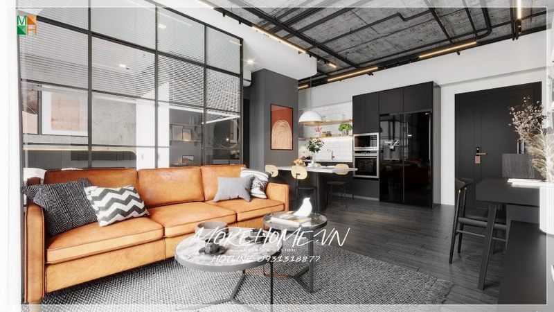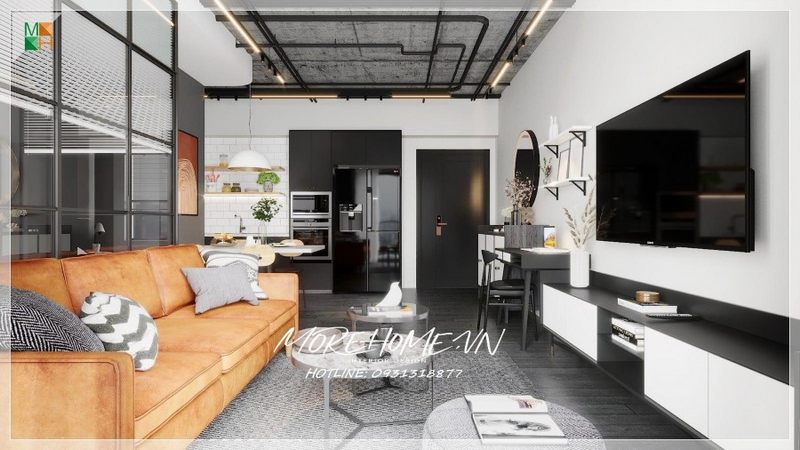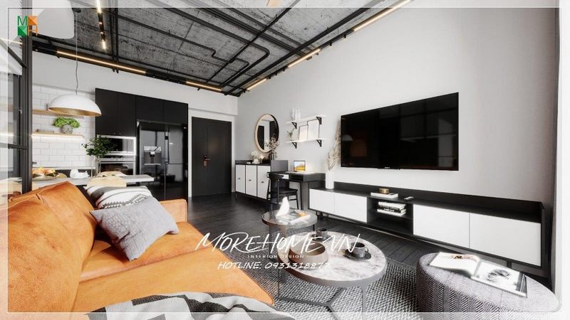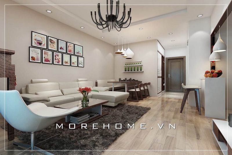 Quan sát gần hơn với phòng khách căn hộ ta chú ý bởi trang trí mà các kiến trúc sư Morehome đặt nhiệt huyết vào tác phẩm của họ.
