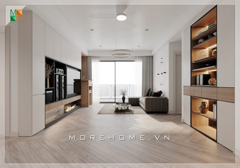 Sự tinh tế được các kiến trúc sư MoreHome thể hiện trong thiết kế nội thất phòng khách chung cư với cách sắp xếp đơn giản tạo sự thoáng đãng, thư thái