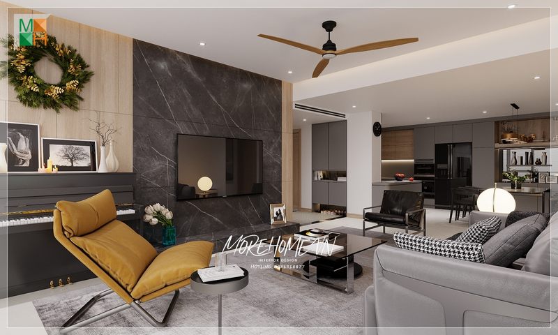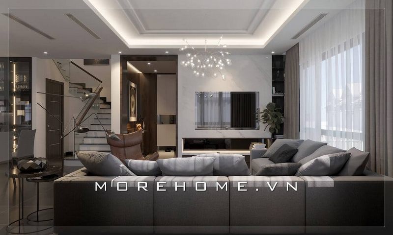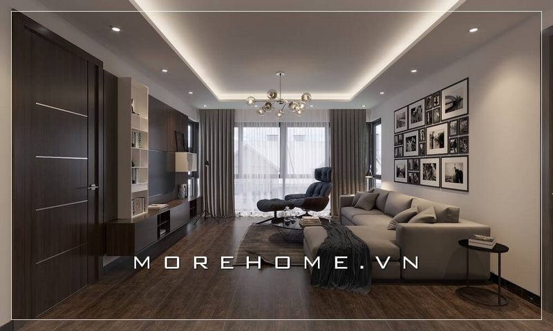 Mang đến mẫu thiết kế phòng khách chung cư tiện nghi với nội thất hiện đại tông màu trắng xám sang trọng và đẳng cấp được tạo bởi KTS MoreHome