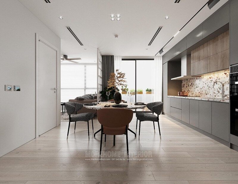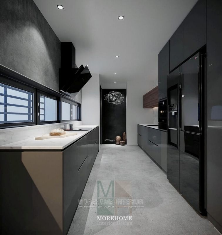 Diện tích bếp nhỏ được tối ưu với tủ bếp chữ i âm tường hiện đại màu xám nới rộng không gian