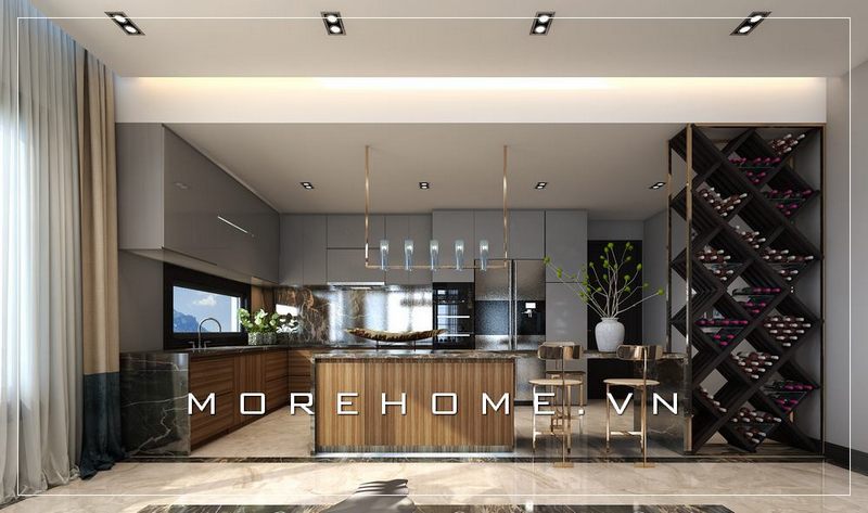Mẫu tủ bếp gỗ tự nhiên cao cấp được Morehome hoàn thiện.