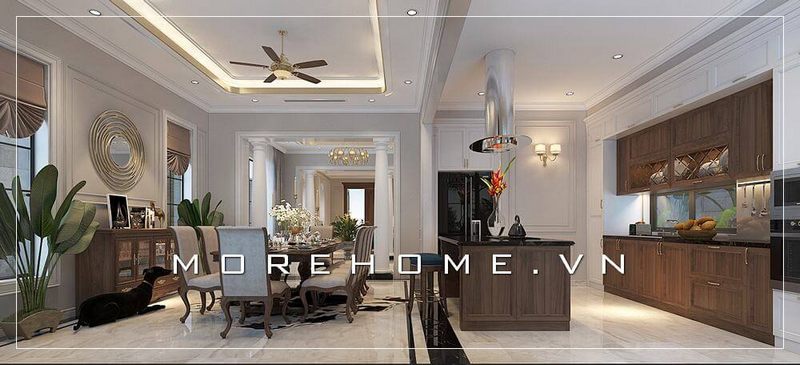 Mẫu tủ bếp gỗ tự nhiên tân cổ điển sang trọng cho phòng bếp biệt thự