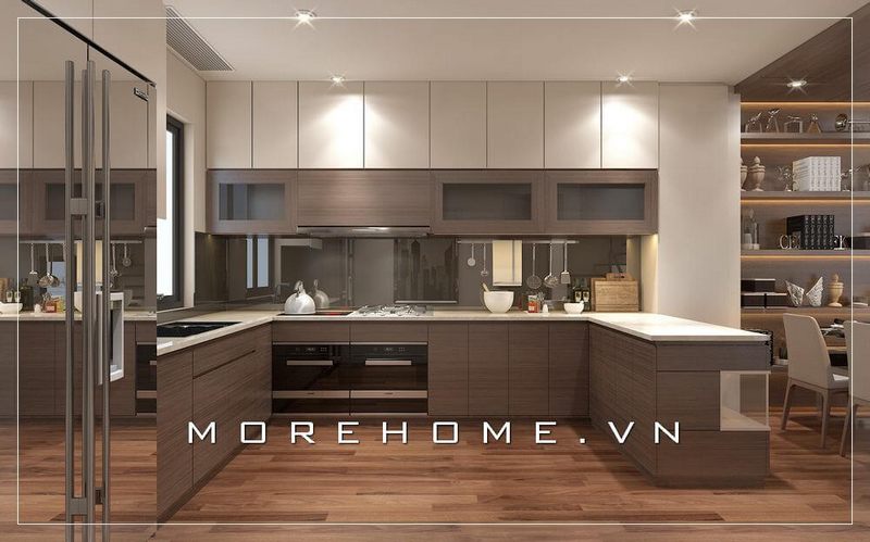Mẫu tủ bếp gỗ công nghiệp hiện đại, thiết kế kiểu dáng chữ U kết hợp thiết bị phòng bếp đa năng mang đến không gian nấu nướng tiện nghi cho người nội trợ