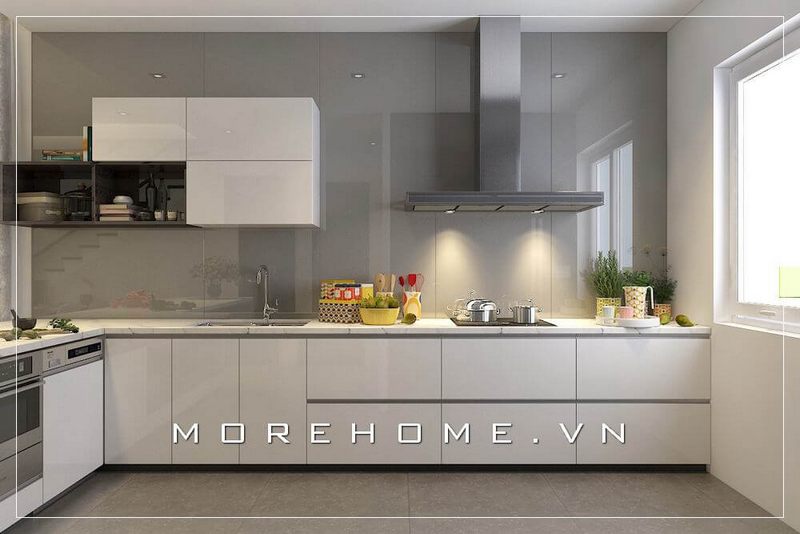 Mẫu tủ bếp gỗ acrylic màu trắng hiện đại cho không gian phòng bếp tiện nghi