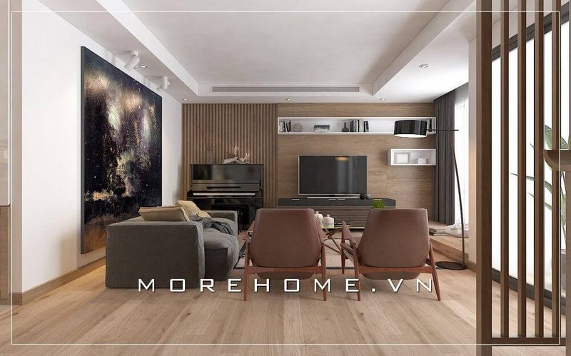 Thiết kế nội thất phòng khách hiện đại, đẹp kết hợp gỗ ốp tường tạo điểm nhấn ấn tượng cho căn hộ chung cư.