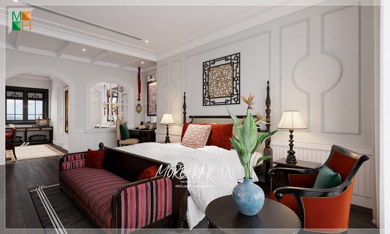 Nội thất phòng ngủ được thiết kế theo phong cách Indochine với tông màu đỏ của nỉ Bỉ kết hợp nội thất gỗ tự nhiên màu đen sang trọng