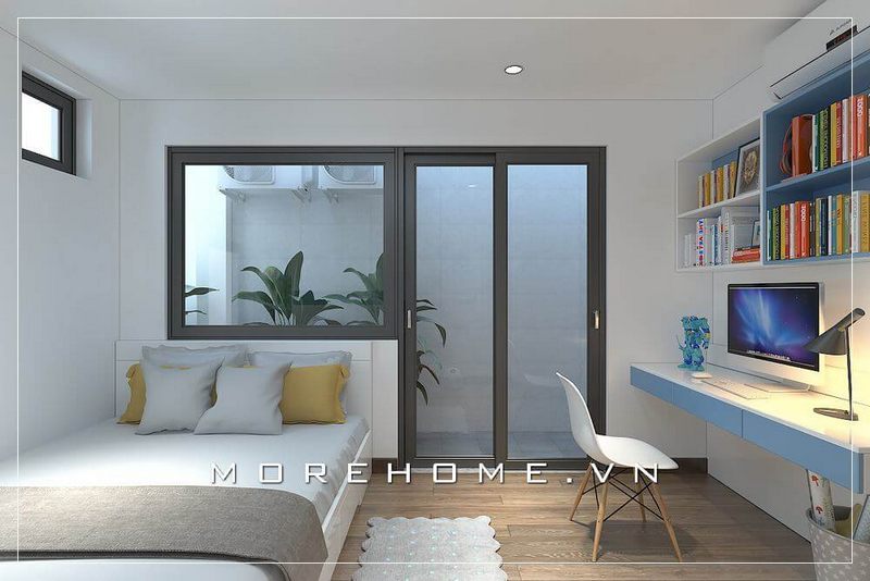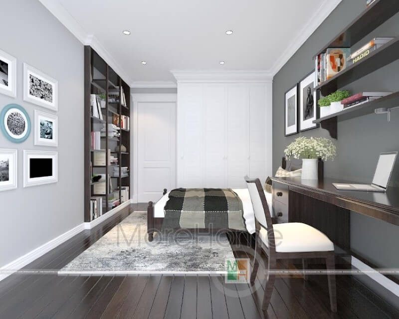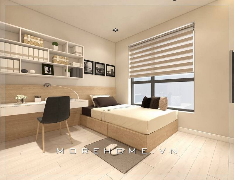 Phòng ngủ nhỏ cần tận dụng diện tích sử dụng tối đa để bố trí nội thất và lược bớt những vật dụng không cần thiết giúp căn phòng thông thoáng hơn. Sử dụng tủ cách lùa kịch trần và tận dụng góc khuất để đặt bàn làm việc giúp căn phòng đầy đủ tiện nghi mà không bị rối mắt