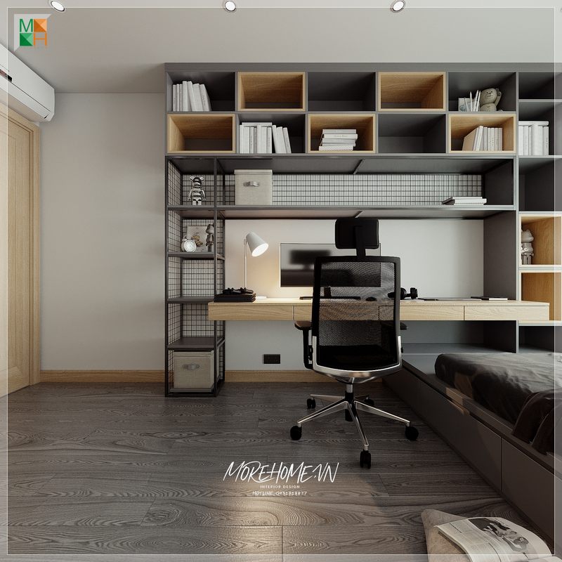 Bàn làm việc được thiết kế sáng tạo đặt ngay đầu giường kết hợp với kệ tủ đựng đồ tạo sự thuận tiện hơn cho người sử dụng