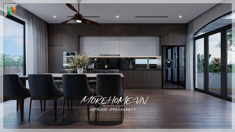 Phòng ăn liền bếp mang tới không gian thoáng đãng mở rộng, thoải mái thuận tiện cho sử dụng, thẩm mỹ cao