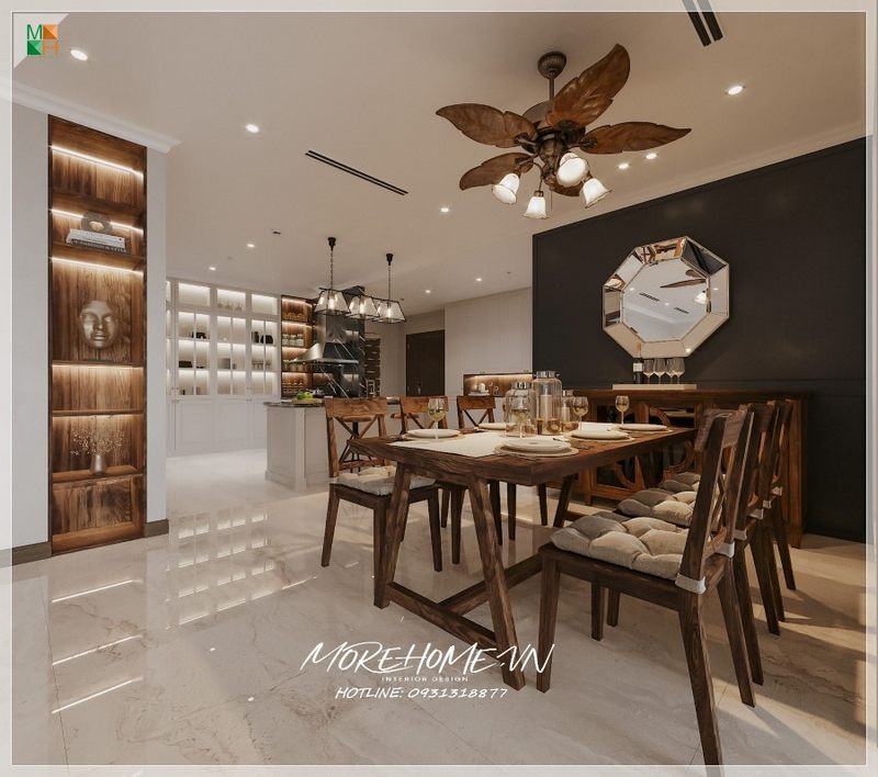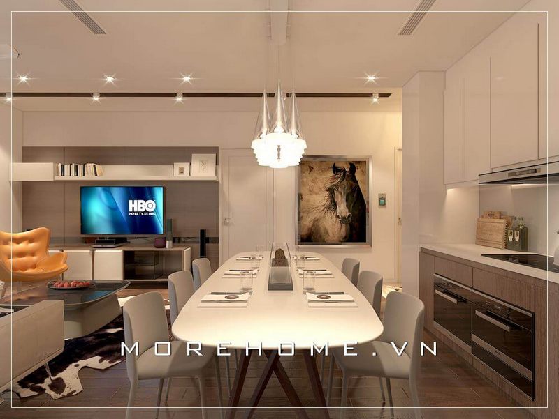 Với thiết kế xu hướng hiện đại phá cách thêm chút cổ điển việc trang trí phòng ăn liền bếp đã giúp cho căn hộ rộng rãi thoáng đãng mà giá trị thẩm mĩ cao.