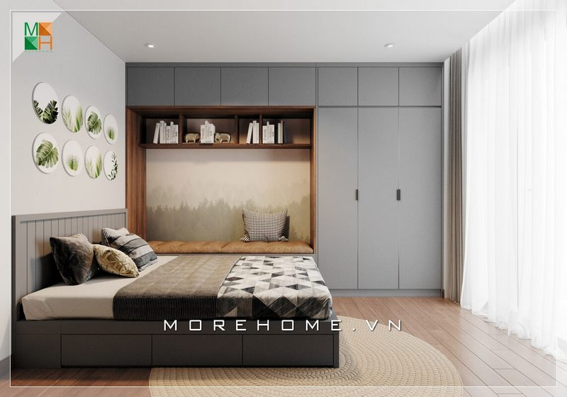 Giường ngủ chung cư hiện đại có ngăn kéo phía dưới đa năng tạo cho chủ nhân căn phòng có thêm không gian lưu trữ đồ dùng cá nhân của mình