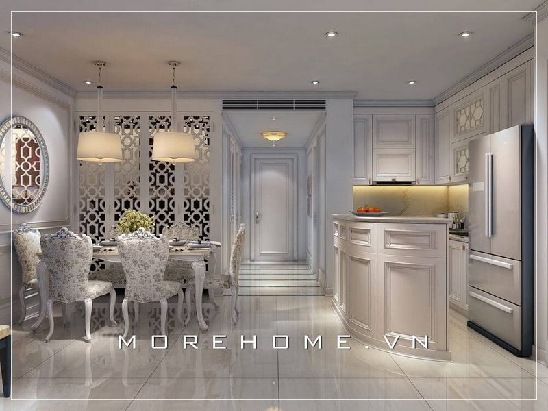 Những gam màu sáng như trắng, be hoặc pastel không chỉ giúp không gian trở nên rộng rãi mà còn tạo cảm giác thoải mái và gần gũi. Bạn có thể thêm một vài phụ kiện màu sắc nổi bật để tạo điểm nhấn mà không làm cho không gian trở nên chật chội. Sử dụng gương cũng là một mẹo thú vị, vì gương phản chiếu ánh sáng, tạo hiệu ứng mở rộng cho căn bếp.