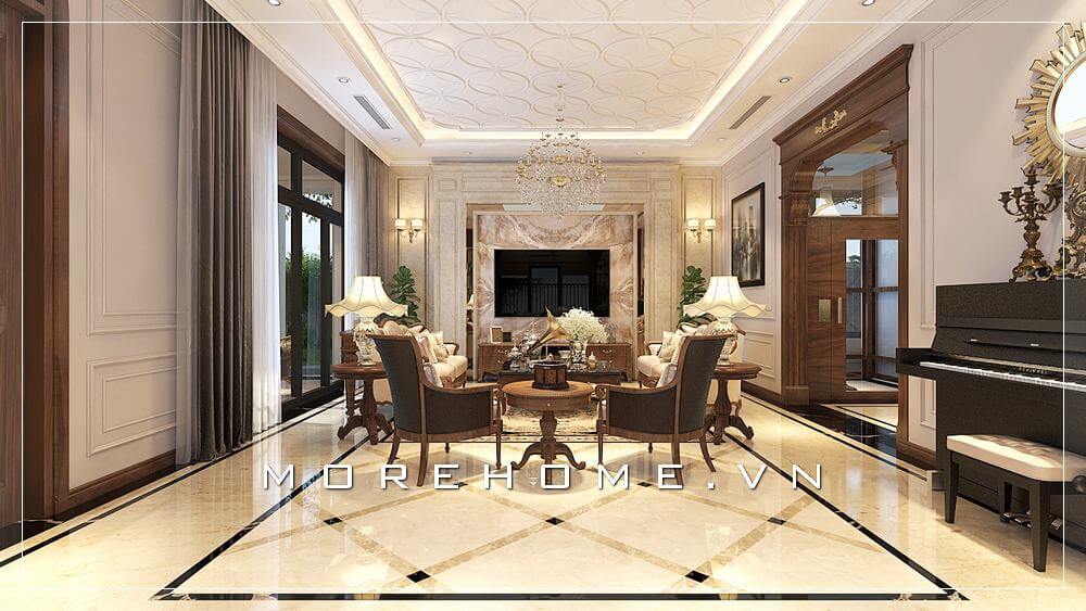 Vẻ đẹp sang trọng lại ấm cúng gần gũi của bộ sofa màu kem và màu xanh thiết kế kiểu văng tân cổ điển là điểm nhấn ấn tượng của nội thất phòng khách biệt thự