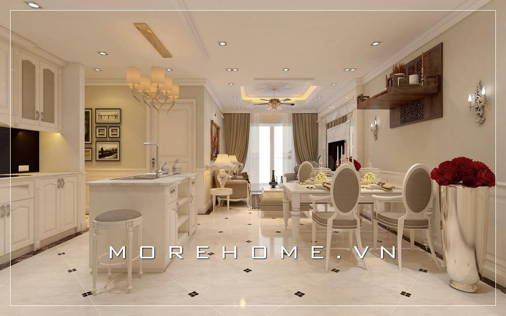 Thiết kế phòng ăn và phòng bếp liền kề nhau, bàn ăn được đặt giữa không gian thiết kế khá đơn giản với 6 chiêc ghế Grance bọc nệm và chiếc bàn với mặt bàn được làm bằng đá nhân tạo Ơđẹp mắt| ấn tượng}